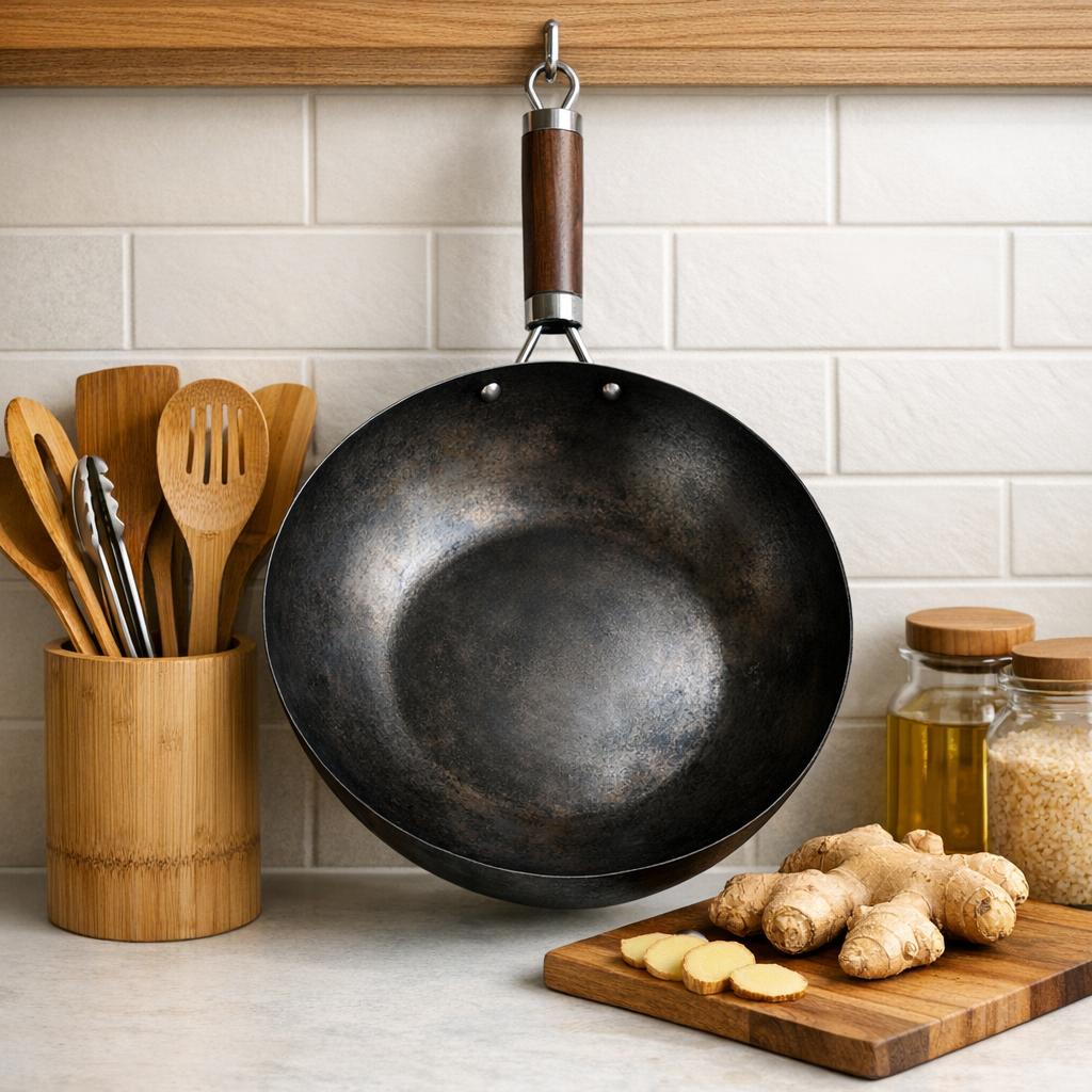 Une biseautée (coupe en diagonale) expose plus de surface à la chaleur et favorise le caramel. C’est un geste classique de la cuisine chinoise qui vaut la peine d’être maîtrisé, tout comme le choix d’un ustensile adéquat est déterminant : la taille et le matériau du wok influencent la capacité à faire sauter correctement la quantité de légumes prévue.